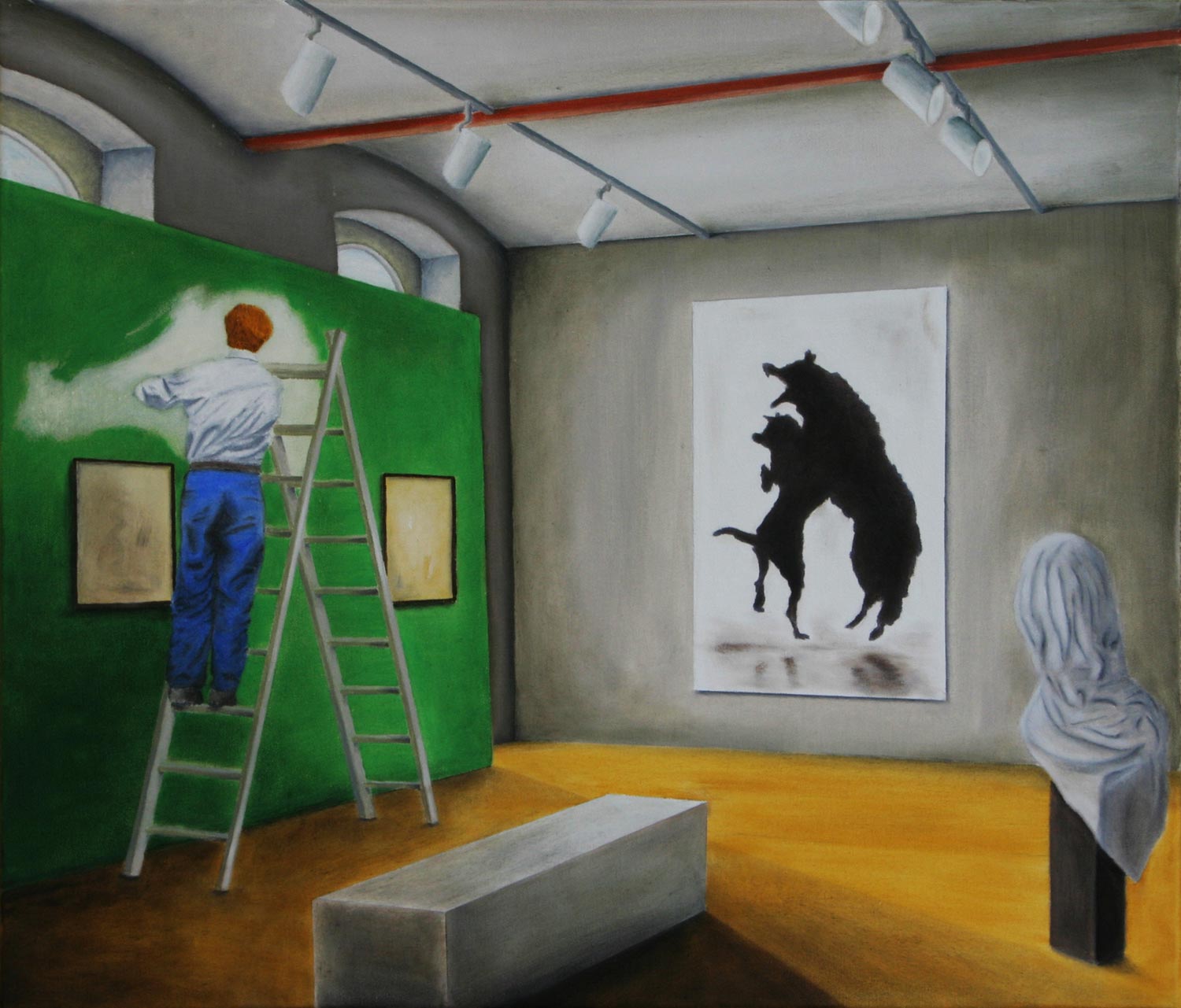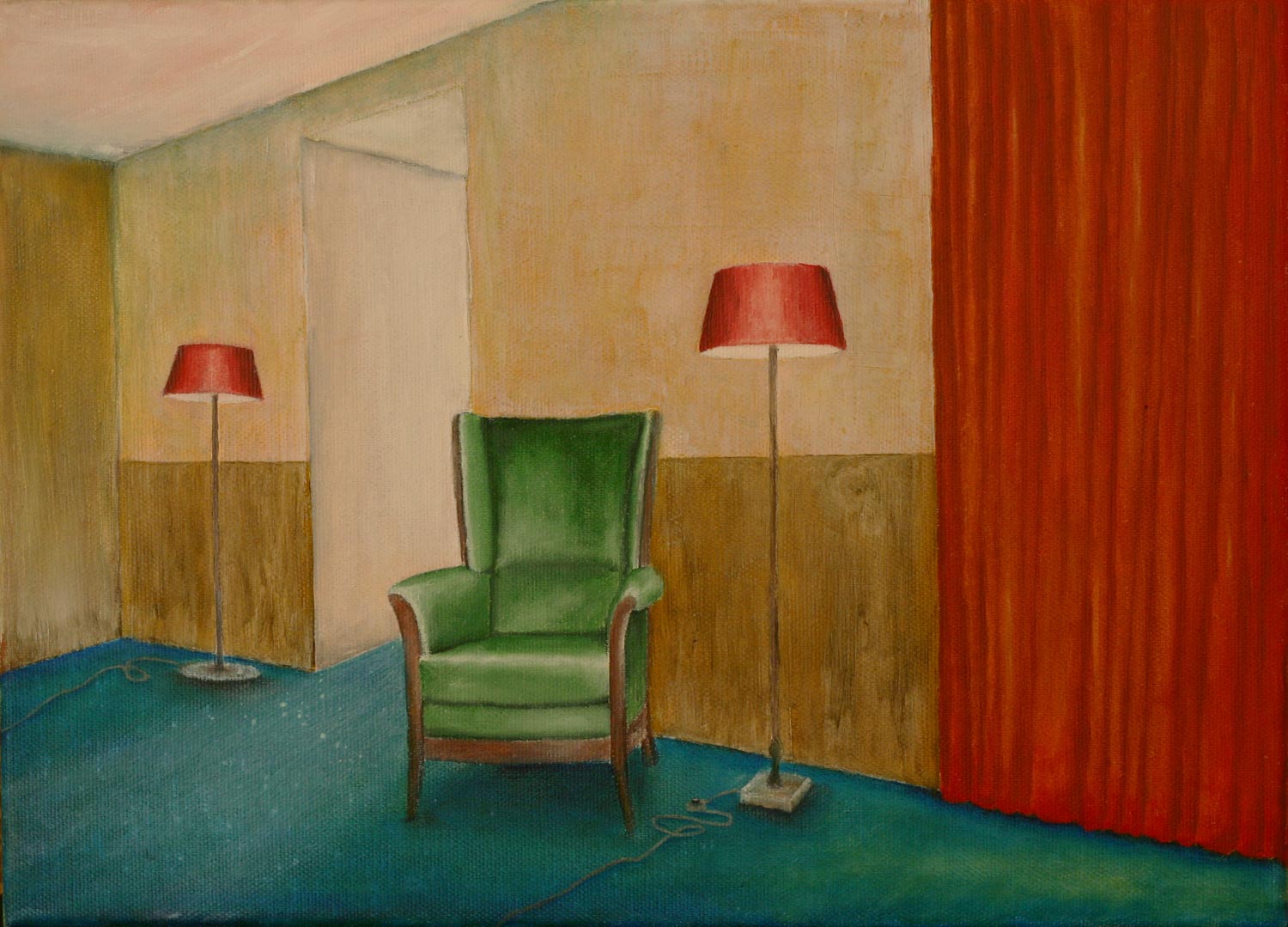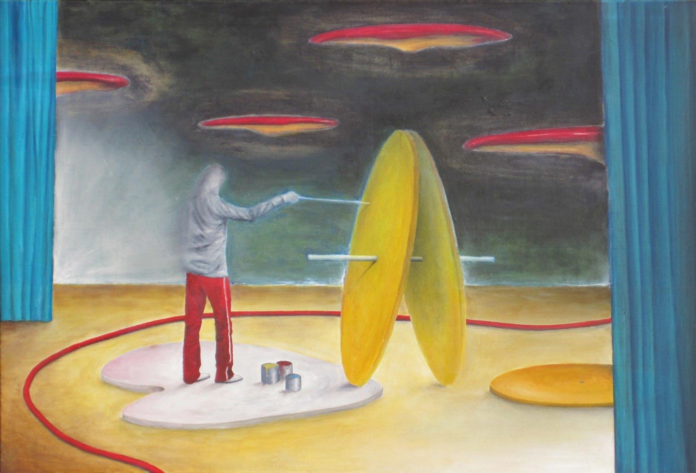 In Leipzig wohnend und selbst gern an der Staffelei werkelnd, ist es einem kaum möglich, dem Einfluss der Neuen Leipziger Schule mit der ihr eigenen figurativen Malerei zu entrinnen. Daher dominiert auch im vorgestellten Oeuvre ein an den Rändern ausfransender Realismus. Die inspirierenden Vorbilder für narrative Mehrdeutigkeit, menschenleere Interieurs oder scheinbar unschuldige Landschaften sind zu erahnen. Abstrakte Malerei ist dünn gesät.